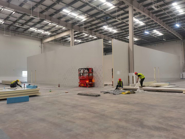庫(kù)房保溫:冷庫(kù)保溫材料采用的是100㎜聚氨酯雙面彩鋼板保溫庫(kù)板,鋼板厚度0.5,芯才密度≥40(±2)kg/m³,阻燃級(jí)別B1。